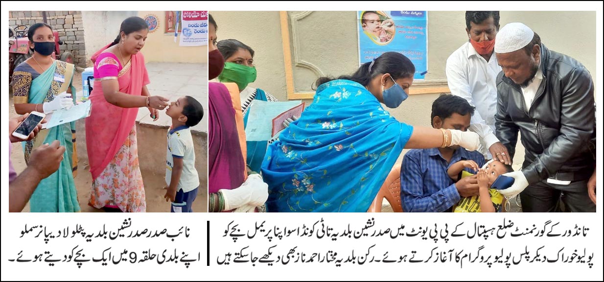 تانڈور میں آج پلس پولیو پروگرام کامیاب رہا جس کے دوران صفر تا پانچ سال کے بچوں کو پولیو خوراک دی گئی۔صدر نشین بلدیہ تانڈور تاٹی کونڈا سواپنا پریمل نے گورنمنٹ ضلع ہسپتال کے پی پی یونٹ میں بچوں کو پولیو خوراک دیتے ہوئے پروگرام کا آغاز کیااس موقع پر ٹی آرایس رکن بلدیہ مختار احمد ناز کے علاوہ دیگر موجود تھے ۔جبکہ نائب صدرنشین بلدیہ پٹلولا دیپا نرسملو نے اپنے بلدی حلقہ 9 شاہی پور میں بچوں کو پولیو خوراک دی ۔