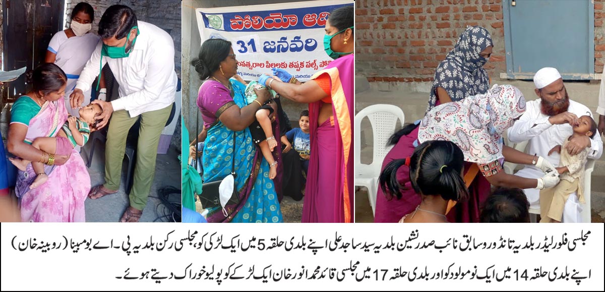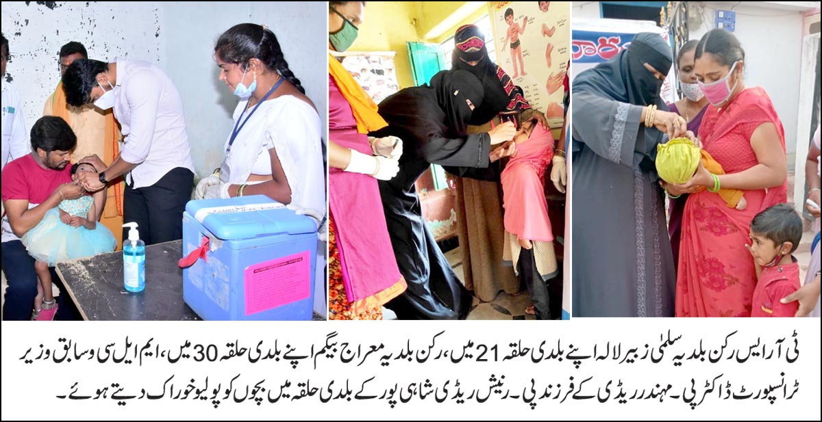 رکن بلدیہ معراج بیگم نے اپنے بلدی حلقہ 30 میں بچوں کو پولیو خوراک دی۔ وہیں ایم ایل سی و سابق وزیر ٹرانسپورٹ ڈاکٹر پی۔مہندرریڈی کے فرزند و نوجوان قائد رنیش ریڈی نے شاہی پور میں رکن بلدیہ نیرجا بال ریڈی کے حلقہ میں اور وجئے ودیالیہ اسکول میں قائم پولیو مرکز پہنچ کر بچوں کو پولیو کی خوراک پلائی۔