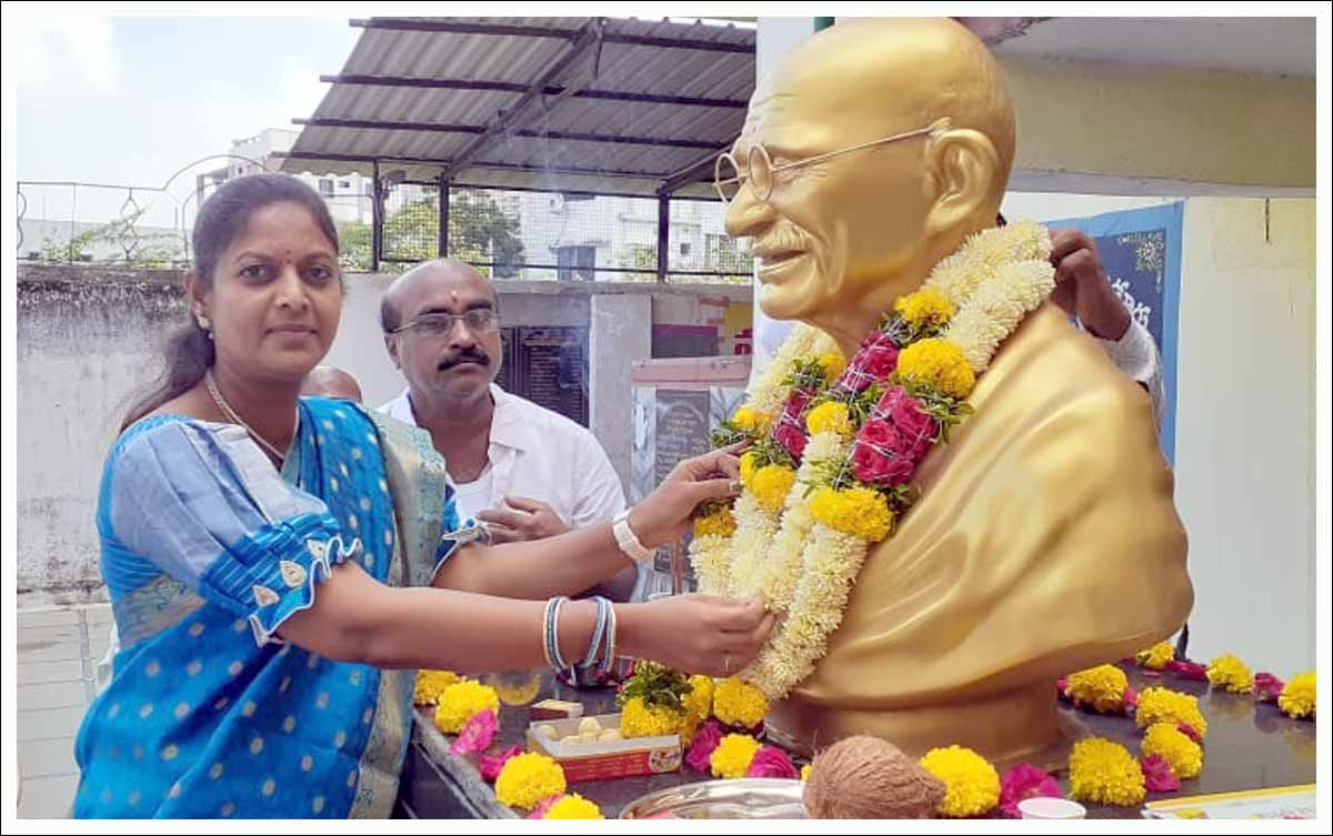 صدر نشین بلدیہ تاٹی کونڈاسواپنا پریمل نے آریہ ویشا کلیانہ منڈپم کے قریب پارک میں موجود مجسمہ گاندھی پر گلہائے عقیدت پیش کئے۔