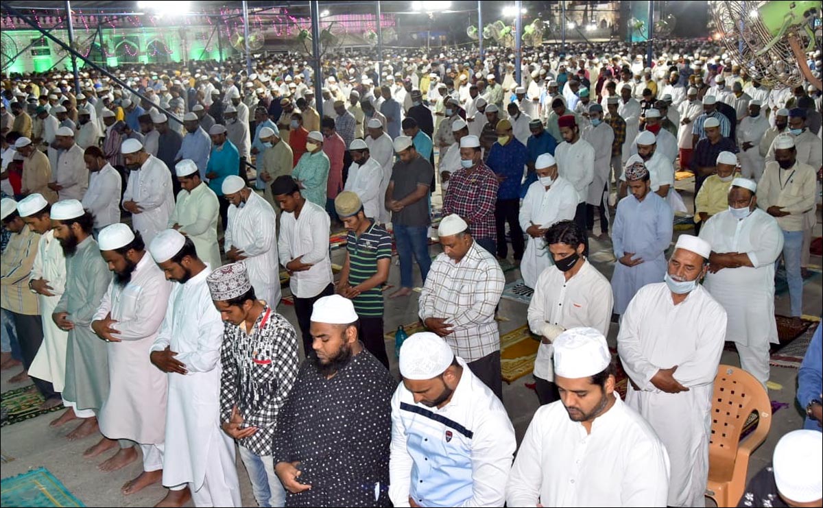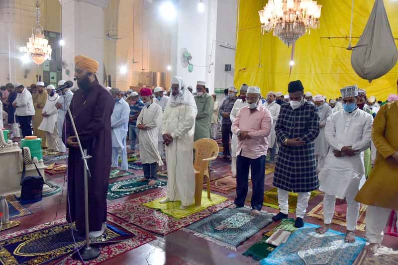 حیدرآباد کی تاریخی مکہ مسجد میں نماز تراویح کے پہلے دہے میں خطیب مکہ مسجد حافظ و قاری مولانا محمد رضوان قریشی ( فرزند سابق خطیب حضرت مولانا عبداللہ قریشی اظہری مرحوم) کی امامت میں فرزندان توحید کی بڑی تعداد نے انتہائی خشوع وخضوع اور بلاء خوف تین پاروں پرمشتمل نمازتراویح ادا کی قبل ازیں نماز عشاء ٹھیک 9بجے ادا کی گئی۔