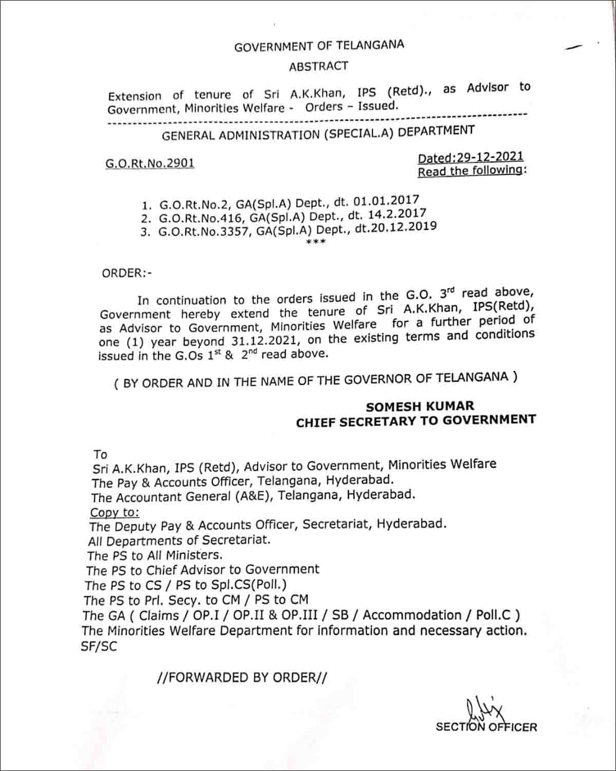 حکومت تلنگانہ نے جناب اے کے خان(عبدالقیوم خان) آئی پی ایس (ریٹائرڈ) مشیرمحکمہ اقلیتی بہبود کے عہدہ کی معیاد میں مزید ایک سال کی توسیع کی ہے۔