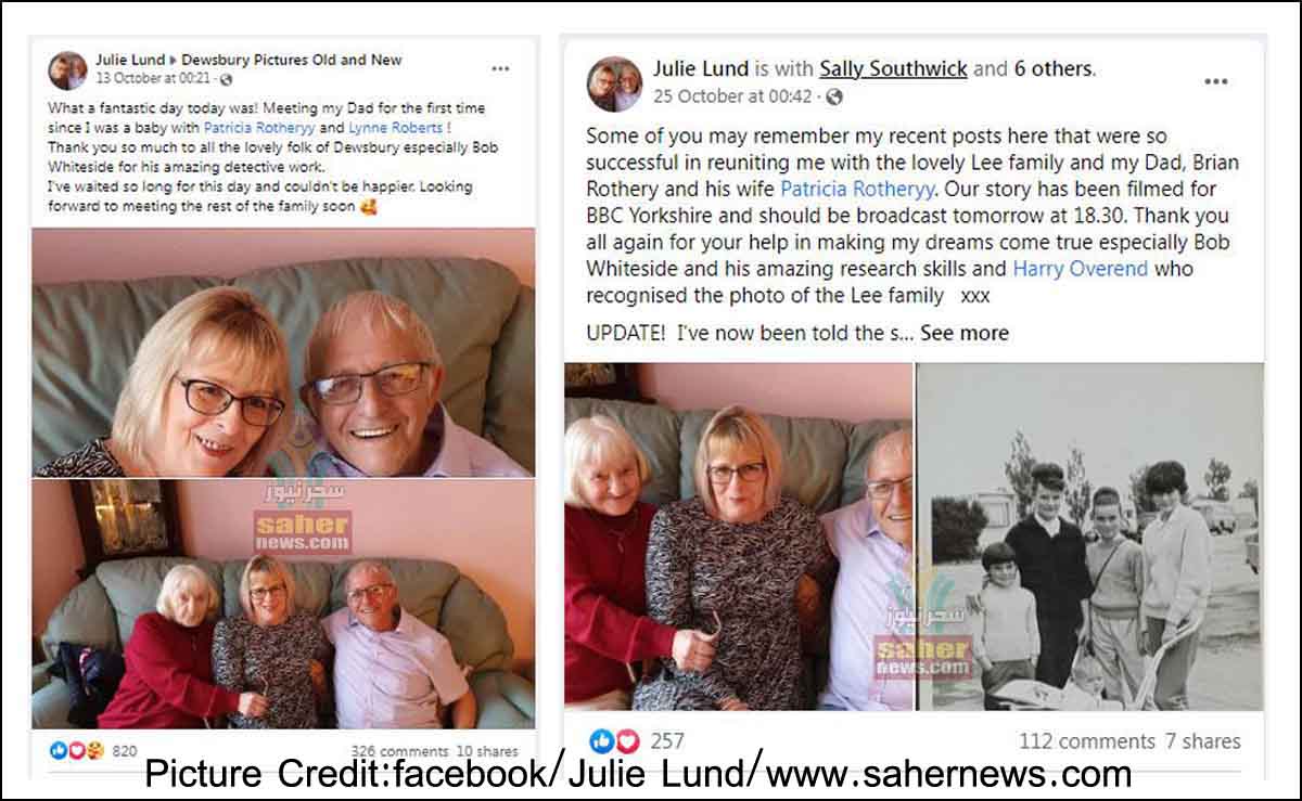 دراصل جولی کے اس پوسٹ کے بعدکئی فیس بک دوستوں اور فیس بک گروپس میں موجود افراد نے جولی کے والد کوویسٹ یارک شائر کے ڈیوس بری سے ڈھونڈ نکالا اور اس کی اطلاع جولی کو دی۔