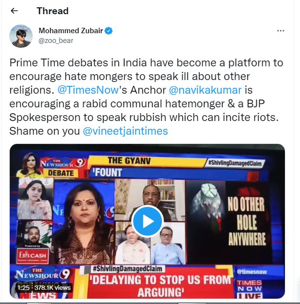 اس ٹوئٹ کے ساتھ محمد زبیر نے لکھا تھا کہ” ہندوستان میں پرائم ٹائم کے ڈیبیٹ دوسرے مذہب کے خلاف نفرت کو ہوا دینے کے ایک پلیٹ فارم بن گئے ہیں۔انہوں نے الزام عائد کیا تھا کہ ٹائمز ناؤ اور اس کی ایڈیٹر اور اس پروگرام کی اینکر نویکا کمار نفرت پھیلانے والوں کو موقع فراہم کررہی ہیں،انہوں نے ٹائمز ناؤ کے مالک ونیت جین کو بھی اپنے ٹوئٹ میں ٹیاگ کرتے ہوئے لکھا تھا کہ شرم آنی چاہئے آپ کو”۔