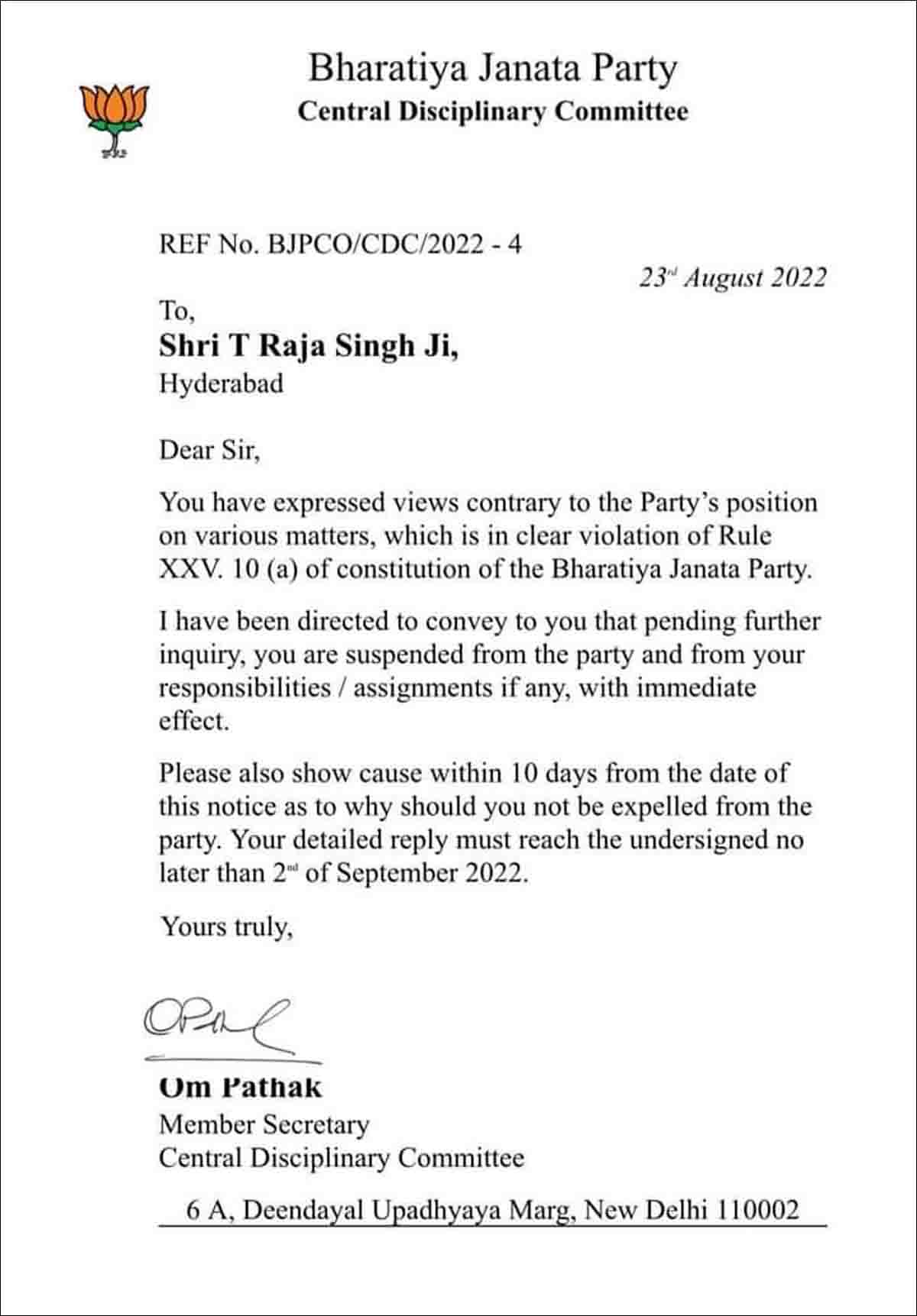 اسی دوران آج سہء پہر بی جے پی کی سنٹرل تادیبی کمیٹی نے کارروائی کرتے ہوئے رکن اسمبلی گوشہ محل حیدرآباد راجہ سنگھ کو بی جے پی سے معطل کرتے ہوئےانہیں وجہ نمائی نوٹس جاری کی ہے۔قومی بی جے پی کی تادیبی کمیٹی کے سیکریٹری اوم پاٹھک نےاس سلسلہ میں ایک مکتوب جاری کیا ہے۔جس میں کہا گیا ہے راجہ سنگھ کی فوری طور پر بی جے پی سے معطلی پرعمل آوری ہوگی۔اور راجہ سنگھ سے جواز طلب کیا گیا ہے کہ کیوں نہ انہیں پارٹی سے خارج کیا جائے؟اس سلسلہ میں راجہ سنگھ سے اندرون دس یوم یعنی 2 ستمبر تک وضاحت طلب کی گئی ہے۔