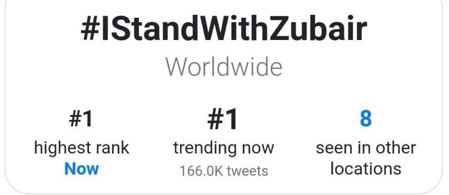 محمدزبیر کی گرفتاری کے فوری بعد ٹوئٹر کے علاوہ فیس بک اورانسٹاگرام پرIStandWithZubair# کا ہیش ٹیگ ٹرینڈچل رہا ہے۔جو کہ دنیا بھر میں ٹاپ پر چل رہا ہے۔