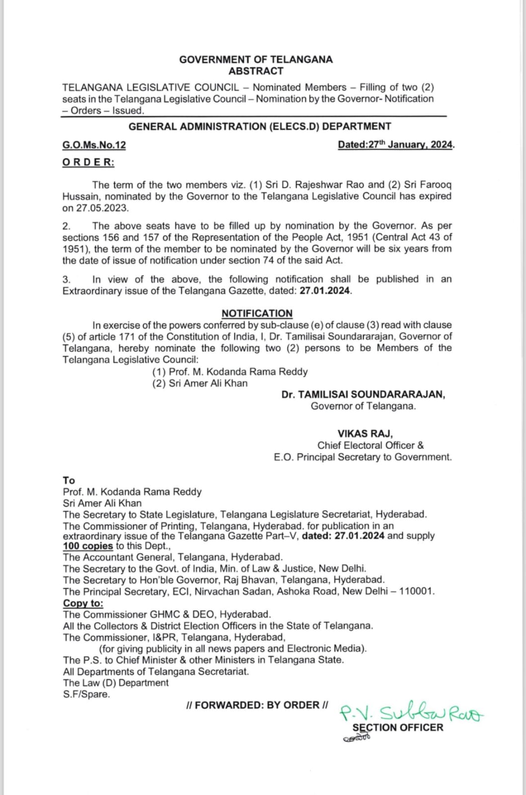 ریاستی گورنر محترمہ تملسائی سوندر راجن کی منظوری بعد پروفیسر کودنڈا رام اور عامر علی خان کی قانون ساز کونسل کے لیے نامزدگی کے احکام آج 27 جنوری کو حکومت تلنگانہ کی جانب سے جی او نمبر G.o. Ms No.12 جاری کر دیا گیا ہے۔جاری کردہ احکام میں بتایا گیاہےکہ گورنر کوٹہ کے تحت ریاستی قانون ساز کونسل کے دو ارکان جناب فاروق حسین اور ڈی۔راجیشور راؤ کی معیاد 27 مئی 2023 کو ختم ہوگئی تھی۔