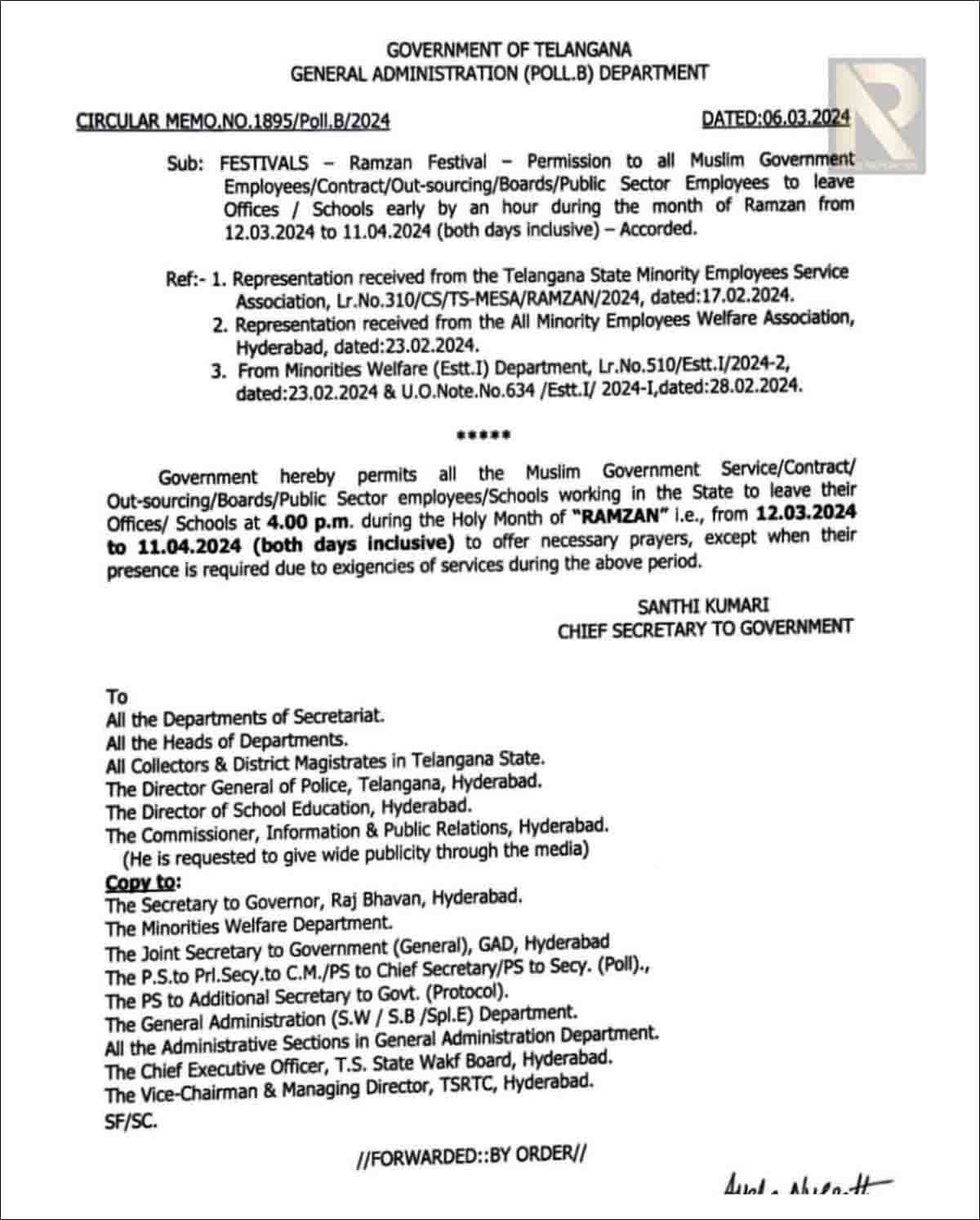 اسی طرح ریاستی چیف سیکریٹری محترمہ شانتی کماری/جنرل اڈمنسٹریشن ڈپارٹمنٹ،حکومت تلنگانہ کی جانب سے کل 6 مارچ کو جاری کردہ سرکیولر نمبر CIRCULER MEMO. NO. 1895/Poll.B/2024 کے تحت ریاست کے تمام مسلم سرکاری ملازمین / کنٹرکٹ ملازمین /آؤٹ سورسینگ ملازمین/بورڈس/پبلک سیکٹرس کے ملازمین ماہ رمضان کے دؤران 12 مارچ بروز منگل تا 11 اپریل بروز جمعرات تک شام 4 بجے اپنے دفاتر سے مکانات جاسکتے ہیں۔