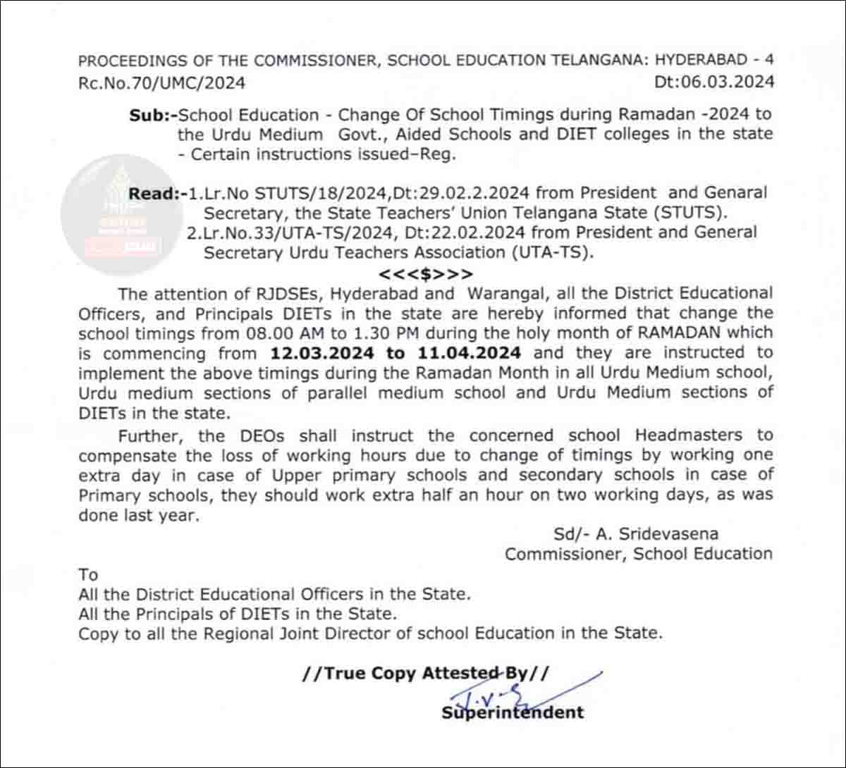 دوسری جانب کل 6 مارچ کوہی کمشنر اسکول ایجوکیشن تلنگانہ محترمہ اے۔سری دیواسینا آئی اے ایس کی جانب سےجاری کردہ ایک اور سرکیولر نمبر RC.No.70/UMC.2024 میں ریاست کے تمام ڈی ای اوز اور ڈائٹ کالجس کے پرنسپلس کو ہدایت دی گئی ہے کہ ماہ رمضان کے آغاز کی مناسبت سے ریاست کے تمام اردو میڈیم اسکولس،متوازی میڈیم اسکولوں کے اردو میڈیم سیکشنس اور DIETs# کے اردو میڈیم سیکشنس میں، ایڈیڈ اسکولس اور ڈائٹ کالجس کے طلبہ کے اسکولی اوقات کو 15 مارچ سے نافذ ہونےوالے نصف دن کے اسکول سےقبل 12 مارچ، 13 مارچ اور 14 مارچ تین دنوں کےلیے 8 بجے صبح تا دوپہر ایک بجے تک کیا جائے۔