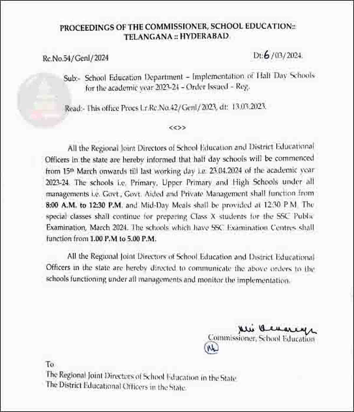 ریاست تلنگانہ میں موسم گرماکے پیش نظر ہر سال کی طرح اس سال بھی ریاستی محکمہ تعلیمات کی جانب سے 15 مارچ بروز جمعہ تا تعلیمی سال برائے 2023-2024 کے اختتام کے آخری دن 23 اپریل بروز ہفتہ تک ریاست میں موجود تمام سرکاری اور خانگی اسکولوں کے لیے نصف دن کے اسکول پرمشتمل سرکاری احکام 6 مارچ کو جاری کر دئیے گئے ہیں۔