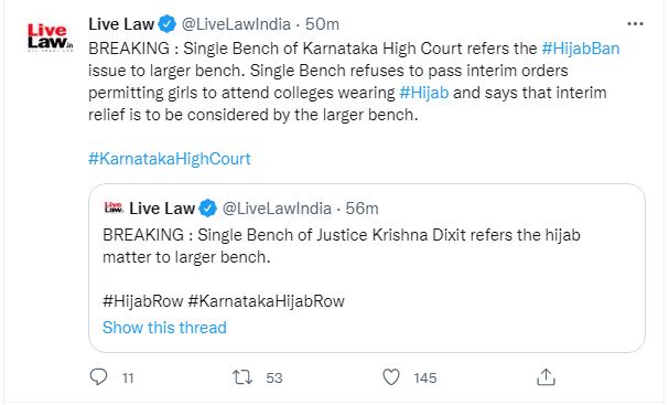 ان درخواستوں کی سماعت کررہی جسٹس کرناٹک ہائی کورٹ ڈکشٹ کرشنا شری پد پرمشتمل سنگل بنچ نے حجاب معاملہ میں عبوری راحت سے انکار کرتے ہوئے کہا کہ اس پر وسیع بنچ ہی فیصلہ کرے گی۔