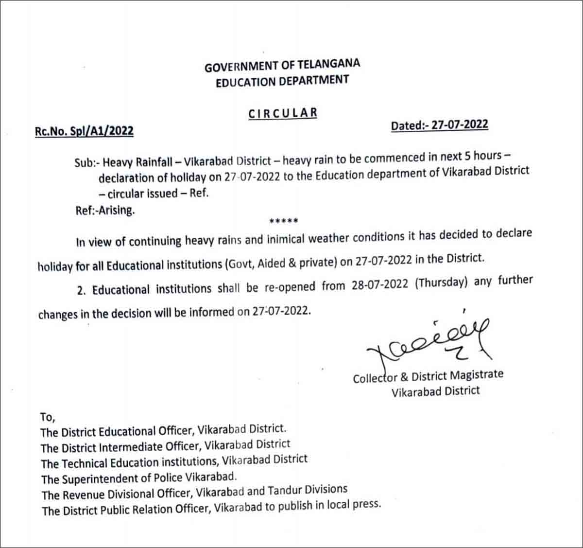وقارآبادضلع میں گزشتہ رات سے جاری شدید بارش،مزید بارش کی پیش قیاسی اورضلع کے مختلف مقامات پر سیلابی صورتحال کے پیش نظر کلکٹر ضلع وقارآباد محترمہ کے۔نکھیلا نے آج شام دیر گئے ایک سرکیولر جاری کرتے ہوئے اعلان کیا ہے کہ کل بروز چہارشنبہ،27 جولائی کوضلع وقارآباد کے تمام سرکاری اور خانگی اسکولوں اور کالجوں کوتعطیل رہے گی۔
