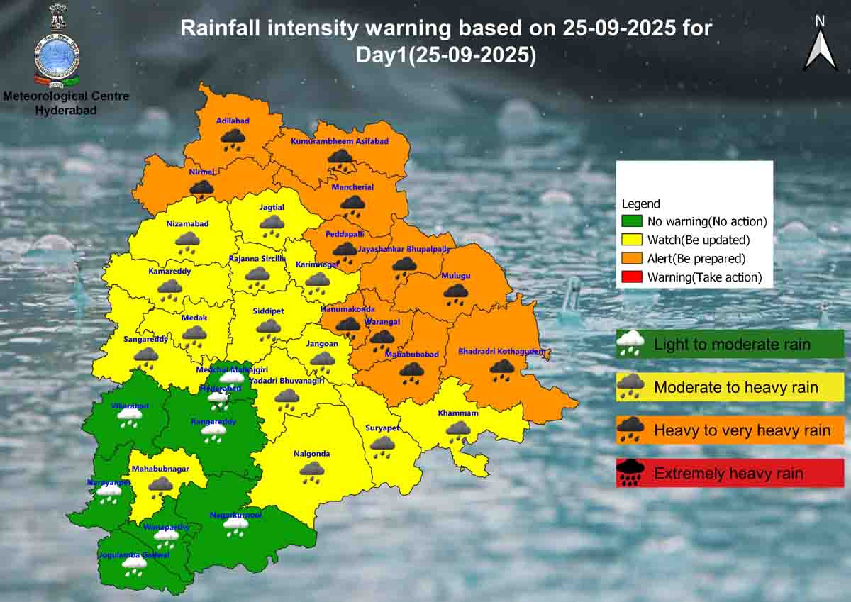 محکمہ موسمیات کی پیش قیاسی کےمطابق شمالی اڑیسہ اور خلیج بنگال میں سمندری لہروں کی اونچائی کو دیکھتے ہوئے کل 26 ستمبر کو تلنگانہ کے 18 اضلاع عادل آباد، کومرم بھیم آصف آباد، منچریال، نرمل، نظام آباد، پیداپلی، جے شنکر بھوپال پلی، ملوگ، بھدرادری کوتہ گوڈم، محبوب آباد، ورنگل اور ہنمکنڈہ میں گرج چمک کےساتھ تیز اور موسلا دھار بارش کا امکان ہے۔محکمہ موسمیات کے مطابق چند اضلاع میں 10 تا 20 سینٹی میٹر تک بارش ریکارڈ کیے جانے کا امکان ہے۔