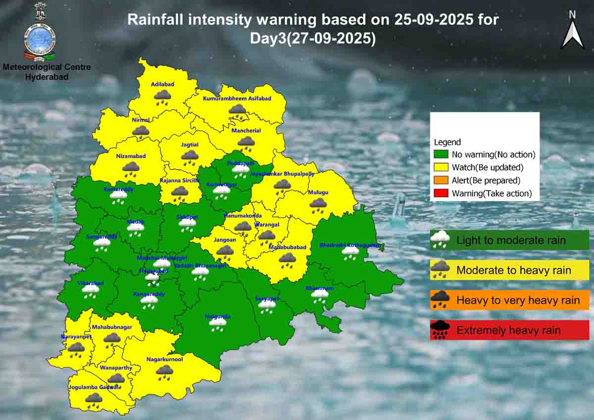 جبکہ محکمہ موسمیات کی پیش قیاسی کے مطابق 27 ستمبر کو تلنگانہ کے اضلاع نرمل، نظام آباد،وقارآباد، میدک، سنگاریڈی، کاماریڈی اور محبوب نگرمیں چند مقامات پر گرج چمک کے ساتھ شدید ترین بارش کا امکان ہے۔