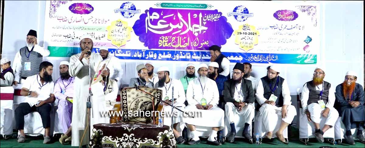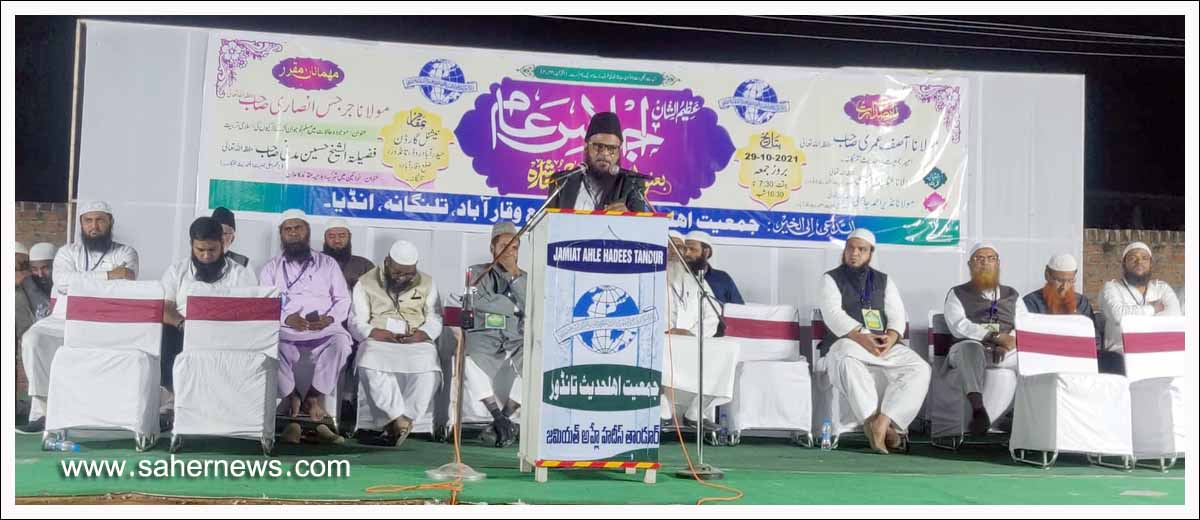 مولانا آصف عمری،امیرجمعیت اہلحدیث تلنگانہ نے جمعیت اہلحدیث تانڈور کے زیراہتمام منعقدہ اس جلسہ اصلاح معاشرہ سے اپنے صدارتی خطاب میں کہا کہ مسلمانوں کی ملی، دینی اور اخلاقی ذمہ داری اصلاح معاشرہ ہے،عمومی طور پر سارےمسلمان اپنا گھر،اپنا سماج، اپنا معاشرہ اور اپنا ملک ان سب کی اصلاح کرنا مسلمانوں کا فریضہ ہے۔کیوں کہ رب العالمین نے ہمیں خیرالامت کہا ہے۔
