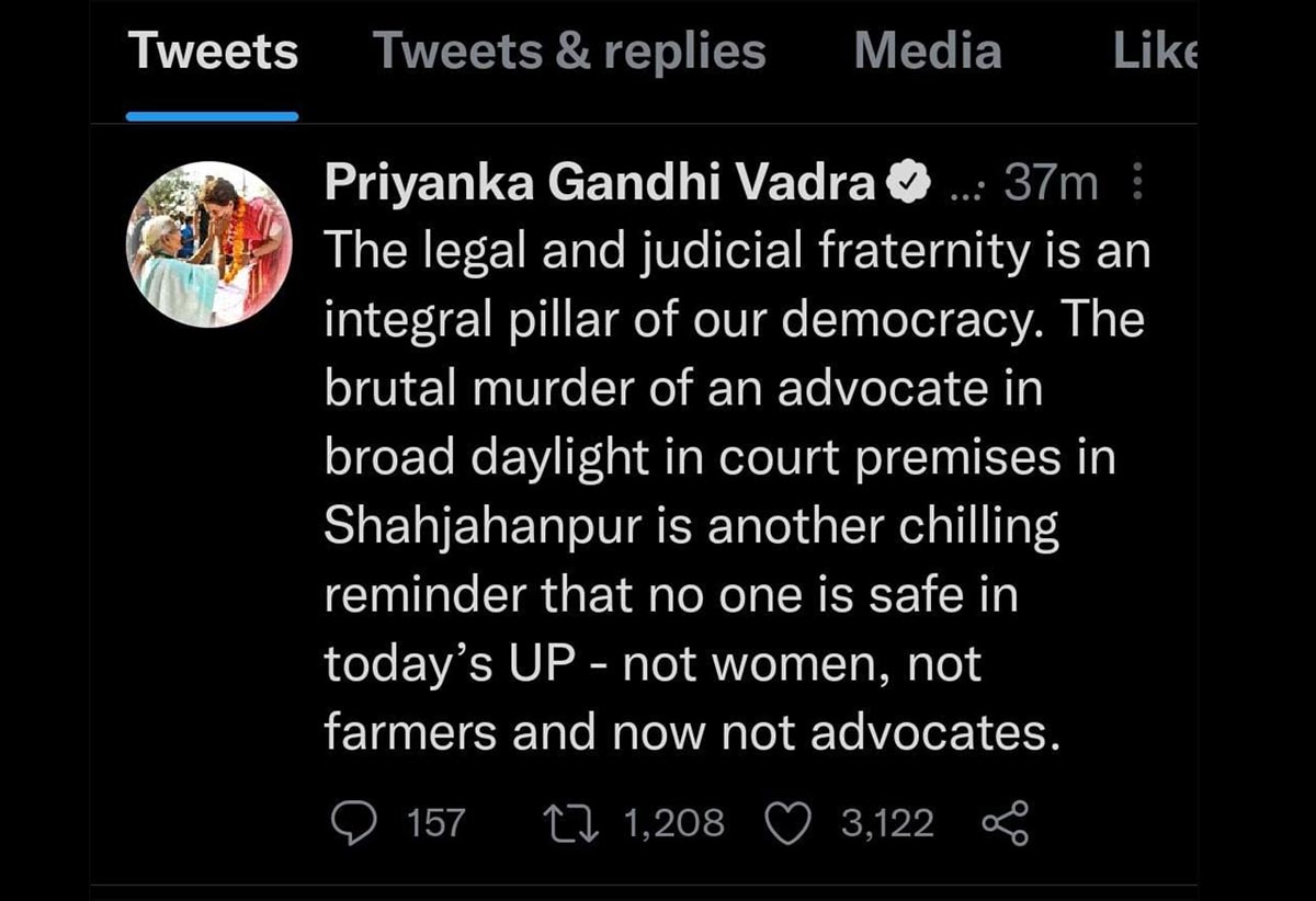 جنرل سیکریٹری کل ہند کانگریس و انچارج اترپردیش پرینکا گاندھی واڈرا نے بھی اپنے ٹوئٹ میں لکھا ہے کہ”قانونی اور عدالتی برادری ہماری جمہوریت کا لازمی ستون ہے۔شاہجہاں پور میں عدالت کے احاطے میں دن کی روشنی میں ایک وکیل کا وحشیانہ قتل ایک اور دل دہلا دینے والی یاد دہانی ہے کہ آج کے یوپی میں کوئی بھی محفوظ نہیں ہے،نہ خواتین ،نہ کسان اور نہ اب وکیل "۔
