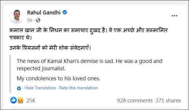 سابق صدر کل ہند کانگریس و رکن لوک سبھا راہول گاندھی نے فیس بک پر لکھا ہے کہ "کمال خان جی کی وفات کا سن کر دکھ ہوا۔وہ ایک اچھے اور معزز صحافی تھے۔ان کے چاہنے والوں سے میری تعزیت "