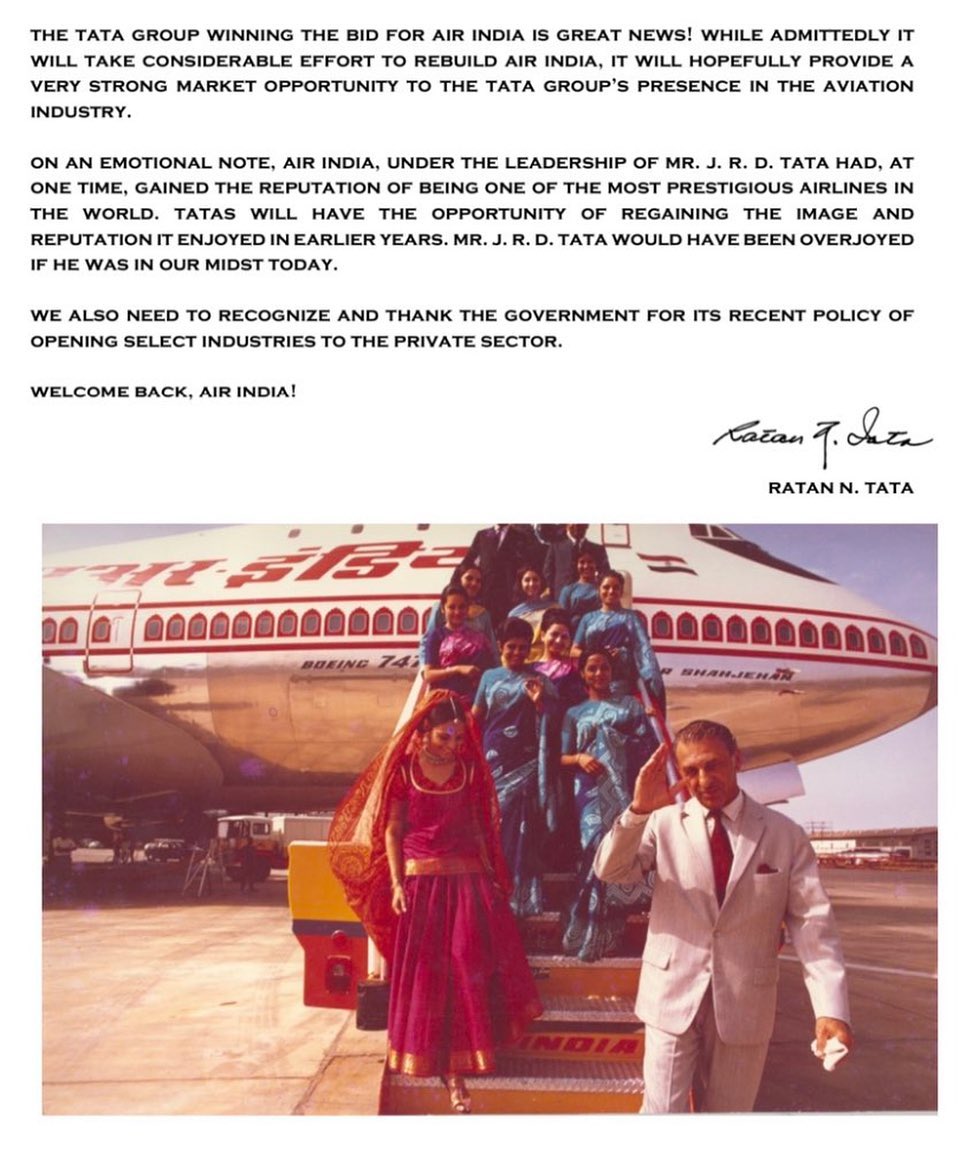 ایرانڈیا کے حصول کے بعد مسٹر رتن ٹاٹا نے خوشی کا اظہار کرتے ہوئے ایک مکتوب جاری کیا ہے۔