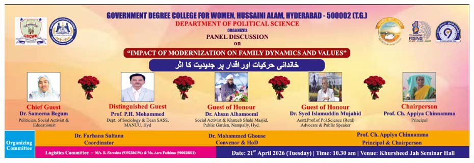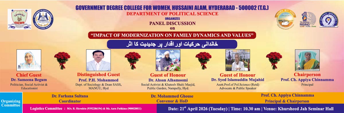 شعبۂ سیاسیات، گورنمنٹ ڈگری کالج برائے خواتین، حسینی عالم، حیدرآباد کی جانب سے "جدیدیت کے خاندانی ڈھانچے اور اقدار پر اثرات” کے موضوع پر ایک پینل مباحثہ 21 ۔اپریل ،بروز منگل بوقت 10:30 بجے دن خورشید جہاں سیمینار ہال میں منعقد کیا جائے گا۔