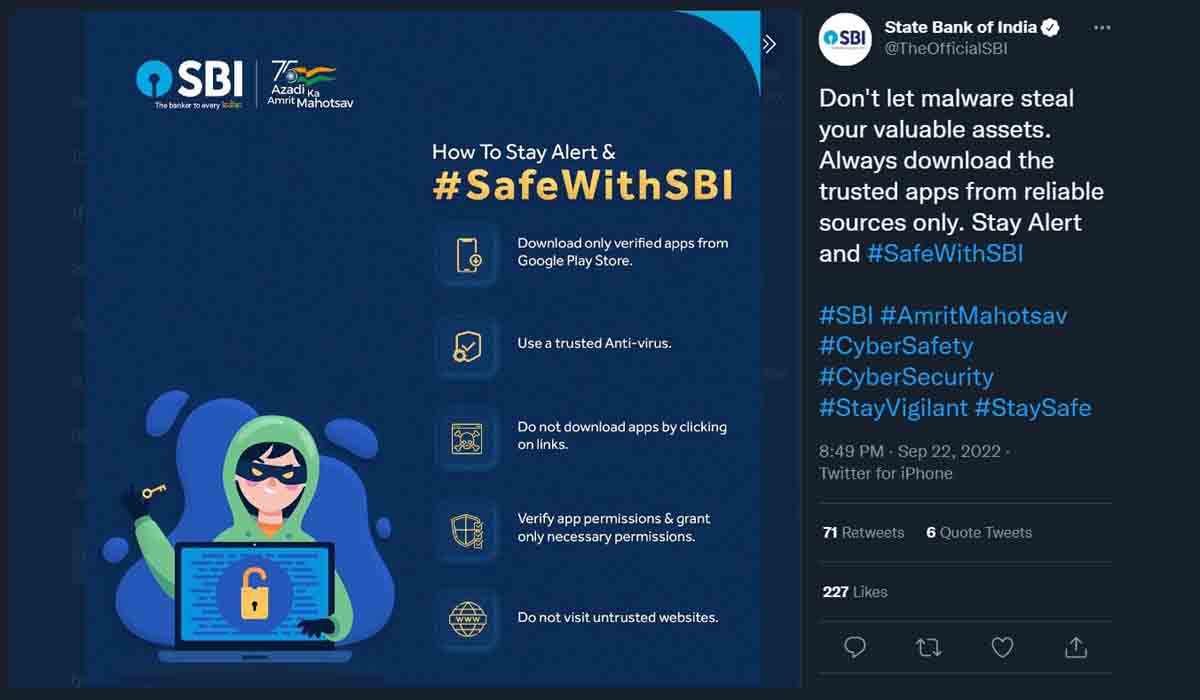 موبائل فون استعمال کرنے والے اور بینک صارفین اس بات کو دھیان میں رکھیں کہ کسی بھی پیغام کے ساتھ ایس ایم ایس کے ذریعہ آنے والی کسی بھی غیر مصدقہ لنک کوغلطی سے بھی ہرگز کلک نہ کریں اور فوری اس ایس ایم ایس کو ڈیلیٹ کردیں۔اور ساتھ ہی جس موبائل نمبر سے بھی اس قسم کے ایس ایم ایس یا کال موصول ہورہے ہیں انہیں فوری بلاک کردیں۔