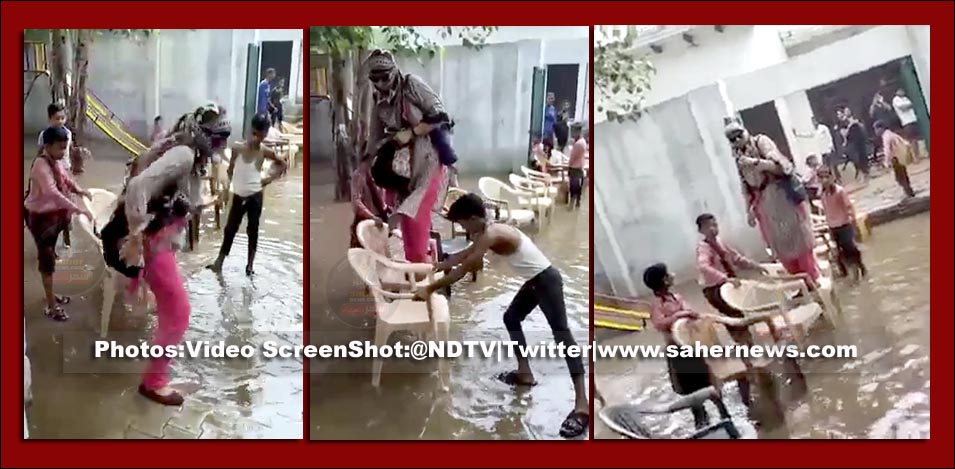 خدمات سے معطل ہونے والی اترپردیش کی اس ٹیچر کے ساتھ بھی ایسا ہی ہوا ہے۔جب وہ اسکول میں داخل ہونے پہنچیں تو اسکول کا احاطہ سیلابی پانی سےمحصور ہوچکاتھا۔اس خاتون ٹیچر نے انتہائی غیر ذمہ داری کا مظاہرہ کرتے ہوئےطلبہ کی جانب سےلگائی جارہیں پلاسٹک کی کرسیوں پر چڑھ کر سیلابی پانی کے اختتام پر فرش پر اتر گئیں۔