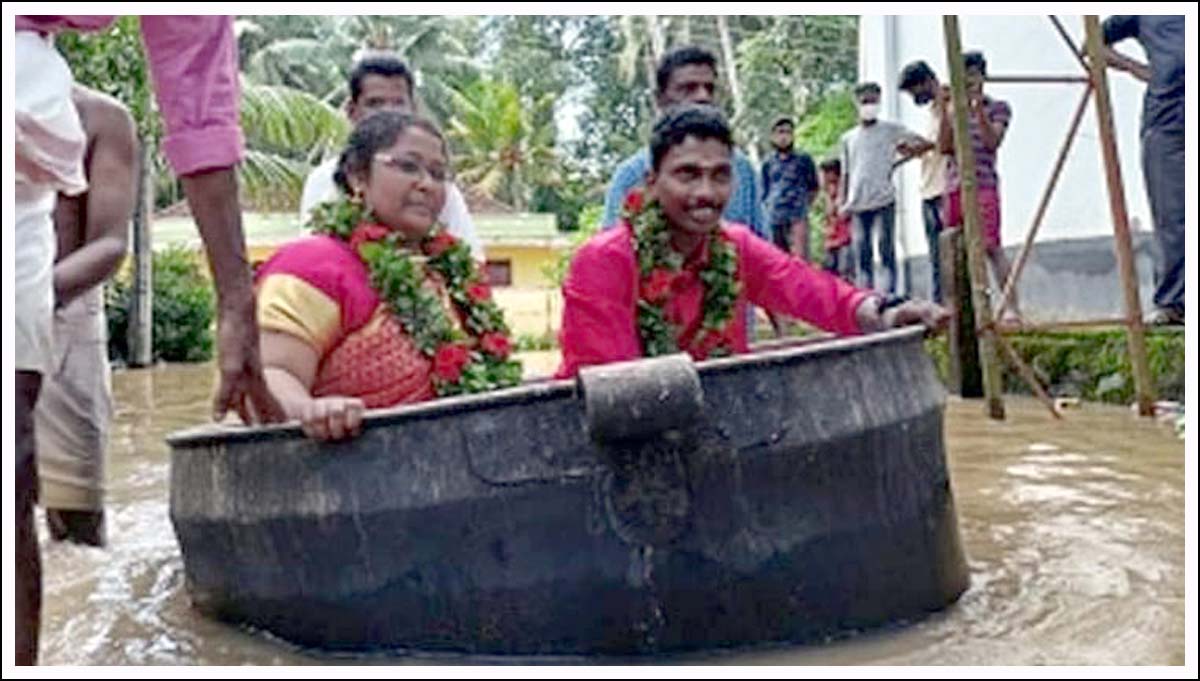 جس میں دیکھا جاسکتا ہے کہ شادی کے لباس میں موجود دُلہا اور دُلہن کھانا پکانے کے ایک بڑے المونیم کے برتن جسے حرف عام میں ” بگونہ ” کہا جاتا ہے میں بیٹھ کر اس سے کشتی کا کام لیتے ہوئے اپنی شادی کی تقریب کے لیے تلاواڑی کے مندر کے قریب موجود کلیانہ منڈپم (شادی خانہ) کی سمت جارہا ہے جو کہ پہلے ہی سیلابی پانی سے بھرگیا ہے۔
