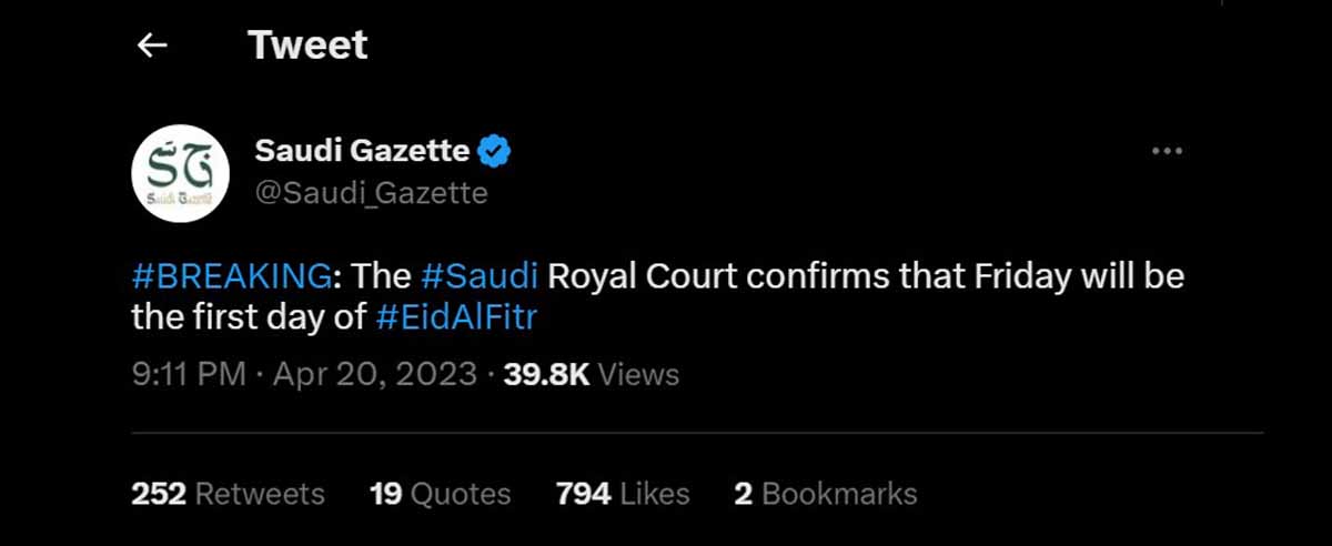 اردو نیوز جدہ اورسعودی گزٹ کی رپورٹ کے مطابق سعودی سپریم کورٹ نےمملکت میں شوال کے چاند کےنظر آنے کی تصدیق کی اور اعلان کیا کہ عیدالفطر جمعہ 21 اپریل سے شروع ہوگی۔سعودی گزٹ نے ٹوئٹر پر سعودی مملکت میں چاند نظر آنے کی اطلاع دی ہے۔
