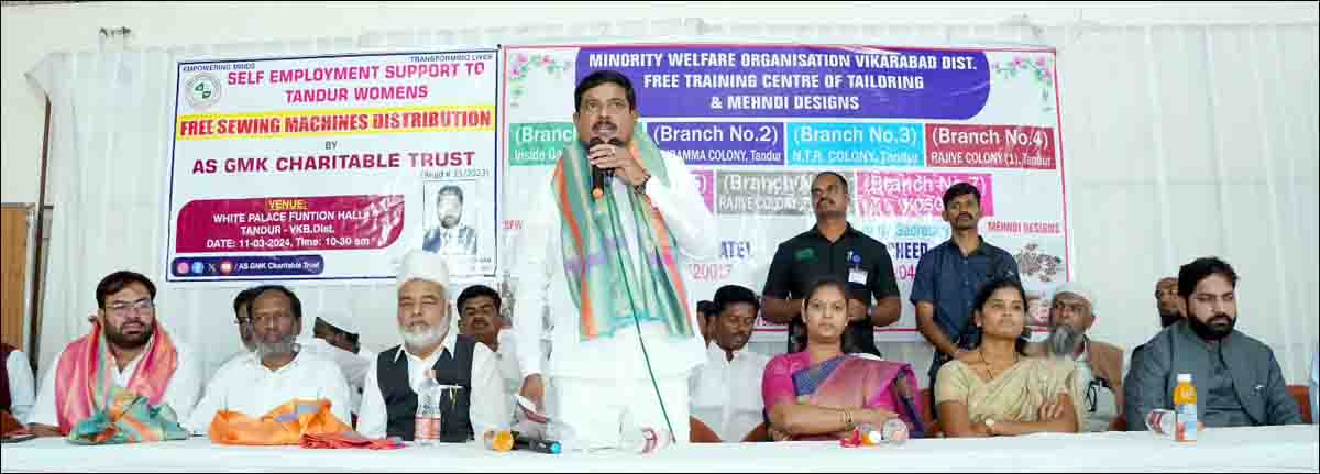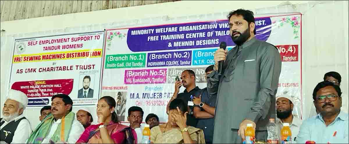 صدرنشین ضلع پریشد و رکن اسمبلی وقارآباد ضلع کے تانڈور میں موجود وائٹ پیالیس فنکشن ہال میں مینارٹیز ویلفیئر آرگنائزیشن، وقار آباد ضلع کے زیر اہتمام منعقدہ تقریب سےخطاب کر رہے تھے۔اس تقریب میں چیئرمین اے ایس جی ایم کے چیرٹیبل ٹرسٹ محمد مجیب خان کی جانب سے ٹیلرنگ کی تربیت مکمل کرنےوالی مستحق خواتین میں صدرنشین ضلع پریشدمسز پی۔سنیتا مہندرریڈی،رکن اسمبلی تانڈور بویانی منوہرریڈی اور چیئرمین اے ایس جی ایم کے چیرٹیبل ٹرسٹ محمد مجیب خان کے ہاتھوں 20 سلائی مشین مفت تقسیم کی گئیں۔اور آرگنائزیشن کی جانب سے ٹیلرنگ اور مہندی ڈیزائننگ کی مفت تربیت حاصل کرنے والی خواتین و لڑکیوں کو سرٹیفکیٹ حوالے کیے گئے۔