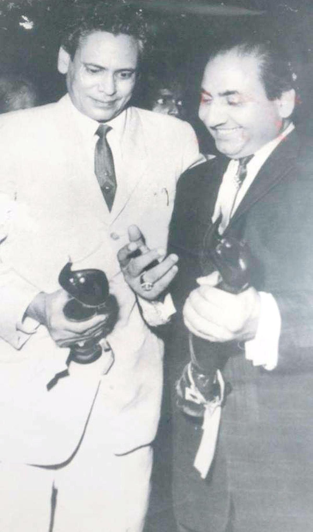 شہنشاہ گلوکار محمد رفیع اور حسرت جئے پوری فلم فیر ایوارڈ حاصل کرنے کے بعد۔