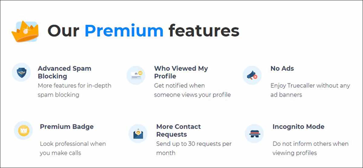 ٹروکالر جہاں محدود خدمات کے ساتھ اپنے استعمال کنندوں کو مفت میں کئی سہولتیں فراہم کرتا ہے وہیں یہ ہیکرس Hackers اوراسپیم کالس کی نشاندہی کرتے ہوئے اپنے صارفین کو آگاہ بھی کرتا ہے کہ کتنے موبائل صارفین نے اس نمبر کو اپنی بلیک لسٹ میں ڈالا ہواہے۔