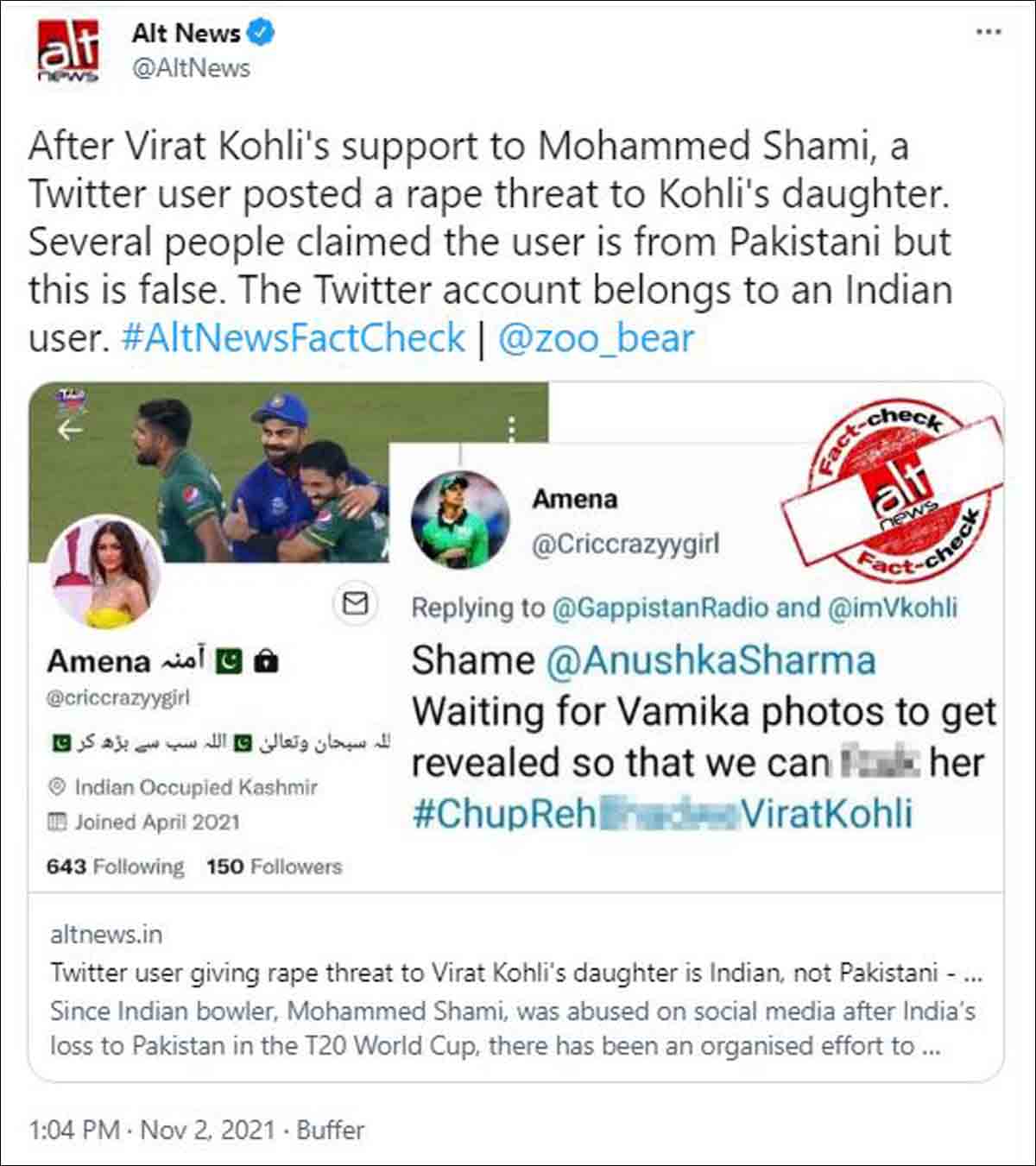 جس پر فیاکٹ چیکنگ ماہرین کی ٹیم پرمشتمل ” آلٹ نیوز ” نے اپنی تیکنیکی صلاحیتوں کے ذریعہ یہ واضح کردیا کہ آمینہ نام کی یہ فیک آئی ڈی پاکستان سے نہیں بلکہ ہندوستان سے ہی چلائی جاتی ہے اور یہ فیک نام سے چلائی جانے والی آئی ڈی ٹوئٹر پر منافرت پھیلانے میں مصروف ہے۔