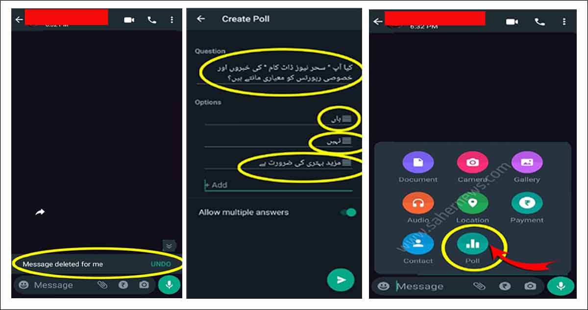 اسی طرح اب واٹس ایپ نے کئی دن قبل پول Poll# (رائے شماری)کا فیچر بھی فراہم کردیا ہے۔اس پول کے ذریعہ کسی مسئلہ پر بالخصوص گروپس میں ارکان کی رائے حاصل کی جاسکتی ہے۔جس کے ذریعہ گروپ کے ارکان کو سوال کے ساتھ جوابات کے تین سے زیادہ آپشن دئے جاسکتے ہیں۔اور گروپ کے ارکان اپنے حساب سے اس پول باکس میں موجود جوابات کو کلک کرکے اپنی رائے دے سکتے ہیں۔