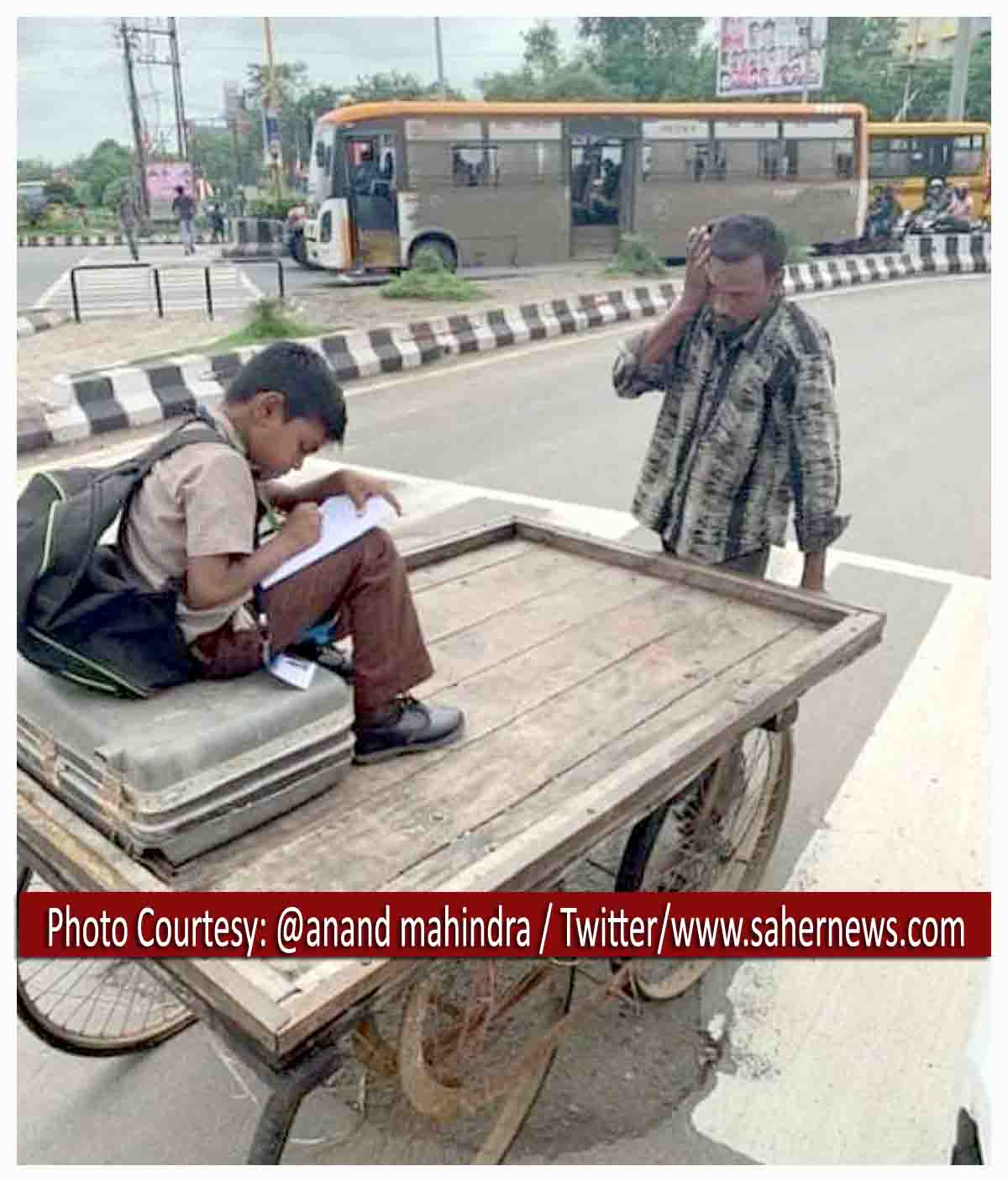 سوشل میڈیا پر وائرل اس تصویر میں دیکھا جا سکتا ہے کہ اس میں ایک باپ اور بیٹا موجود ہیں،باپ اپنی ٹھیلہ بنڈی کے ایک کنارے پر موجود ہے اور بیٹا جو کہ اسکولی ڈریس میں بنڈی پر موجود ایک پرانے بریف کیس پر بیٹھ کر پڑھائی میں مصروف ہے۔یہ تصویر دل کو چھو لینے والی ہے۔
